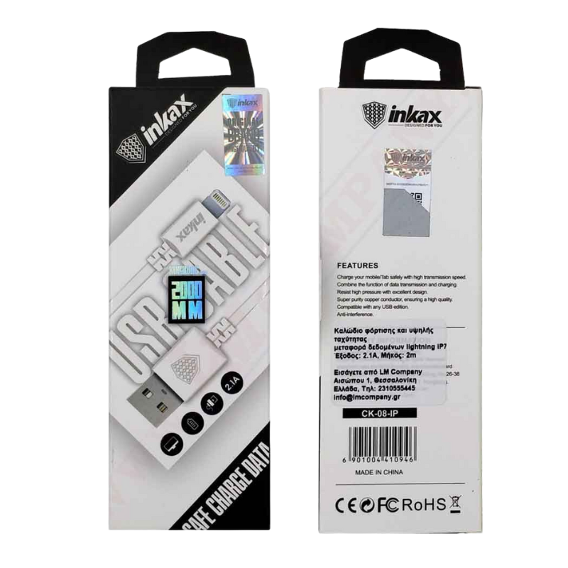 El Cable Inkax CK-08 para iPhone combina durabilidad, velocidad y estilo en un diseño moderno y resistente. Con sus 2 metros de longitud, te ofrece la libertad de cargar o sincronizar tu dispositivo cómodamente desde cualquier lugar, sin limitaciones de distancia.